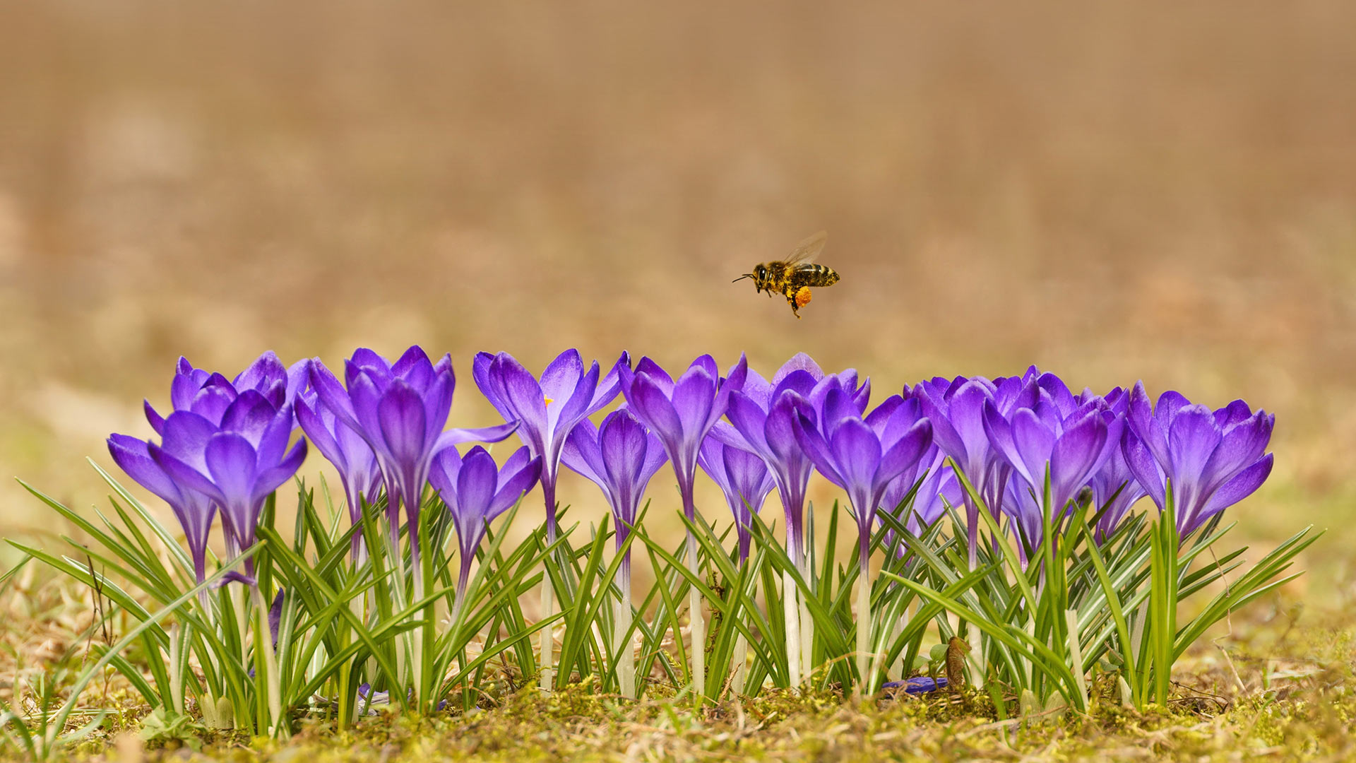 Honey bee flying over crocuses in the Tatra Mountains, Poland (© Mirek Kijewski/盖蒂图片社)